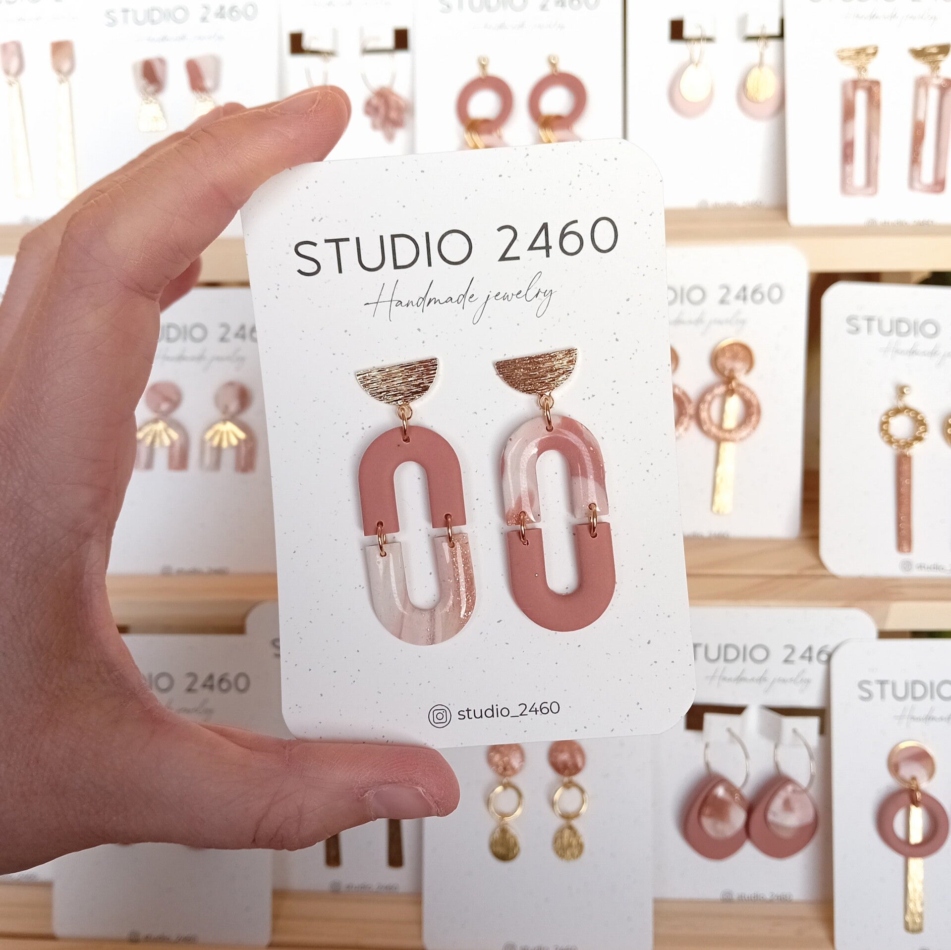 - afmeting: de studio 2460 kaartjes zijn 10.5cm hoog en 7.5cm breed, dan kan u de grootte van de oorbellen inschatten
