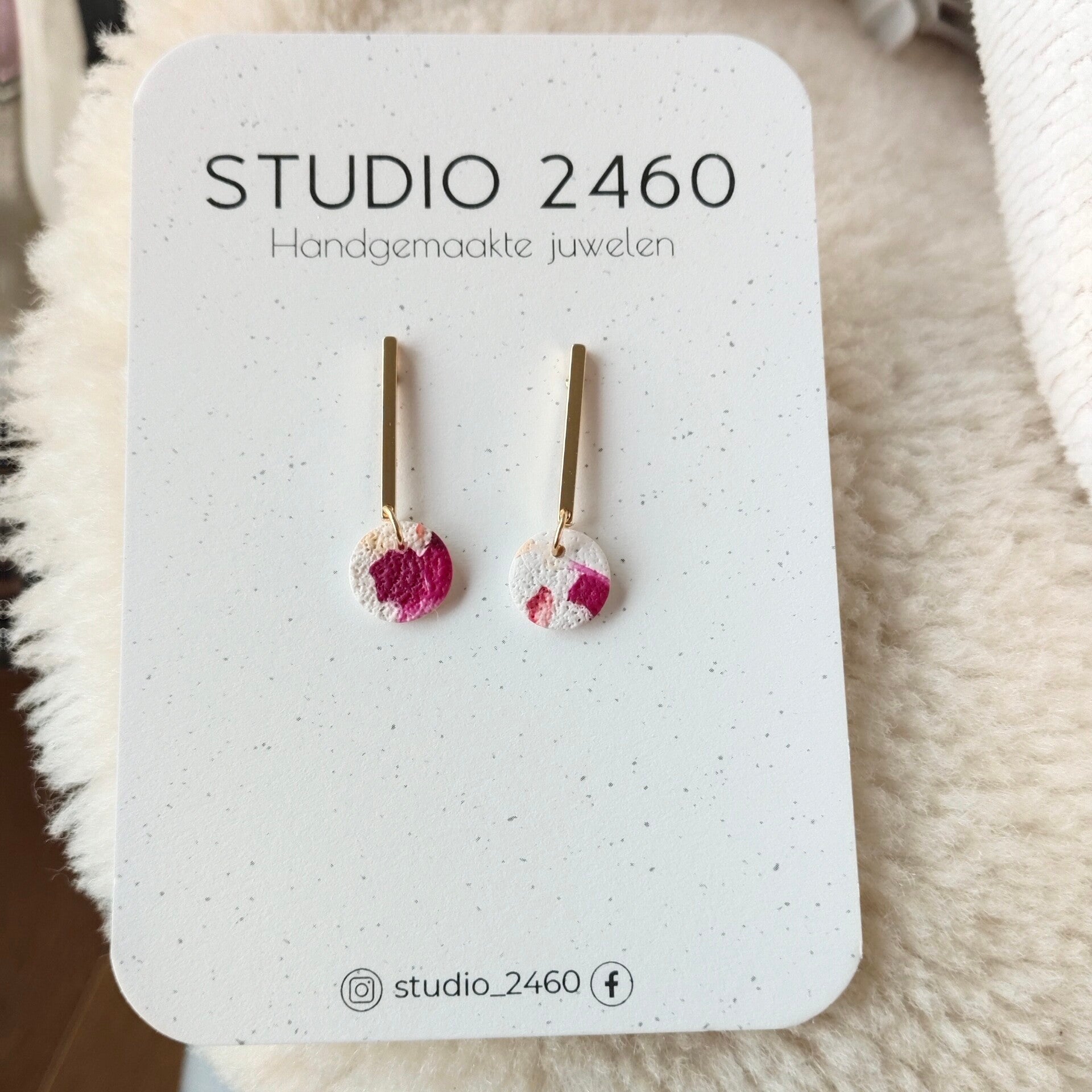 - Afmeting: de studio 2460 kaartjes zijn 10.5cm hoog en 7.5cm breed, dan kan u de grootte van de oorbellen inschatten