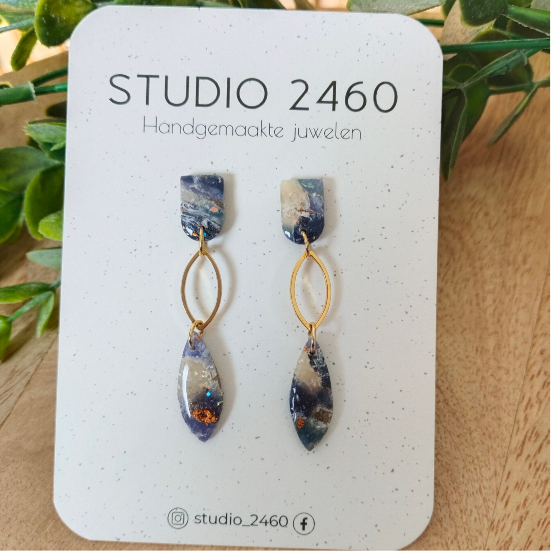 Tenerife Sea, de perfecte naam voor deze collectie! SO IN LOVE... Tinten blauw, beige, goud en rosé goud in marmerpatroon afgewerkt met een blinkend laagje hars. Past bij vele kleurtjes en zeker bij jeans. Kan zowel voor casual wear als bij speciale gelegenheden.